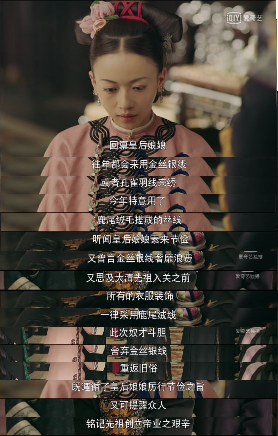 这远远不够,在呈上礼物的时机上,她等候良久,特意挑选了皇上为皇后献礼之后,这样皇后心情甚佳,尽管一眼看穿绣线被调用,既不是金线,也不是银线,更不是孔雀羽线,她还是会给魏璎珞解释的机会,这样,魏璎珞深深看了眼皇后之后, 凭借三寸不烂之舌,将这一危机把握好,变成了进身之阶。她说到: