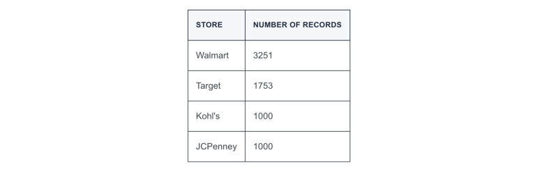 为了了解这些商店如何选址,我收集了所有关美国主要连锁零售超市Target、Walmart、JCPenney和Kohl在美国的地理位置数据。以下是数据样本: