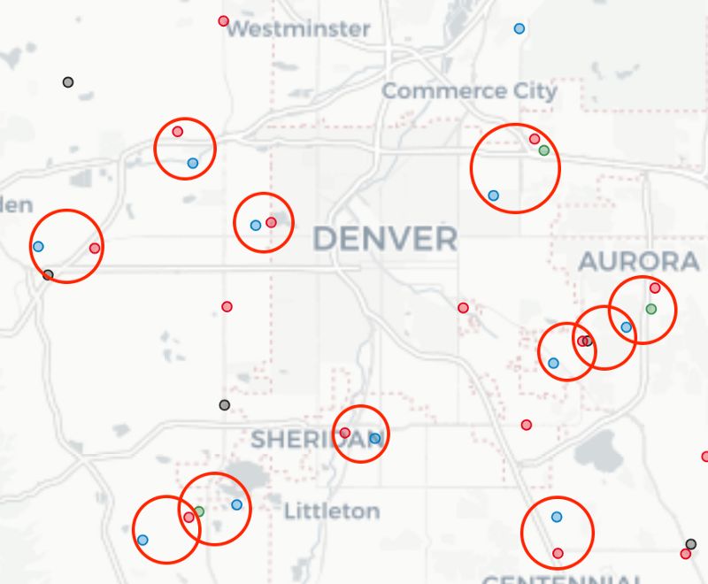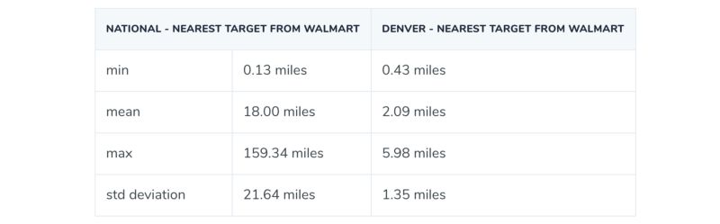 这些地图肯定表明霍特林法则在起作用。计算了商店之间的距离后,丹佛地区最近的Target和沃尔玛之间的平均距离仅为2.09英里。