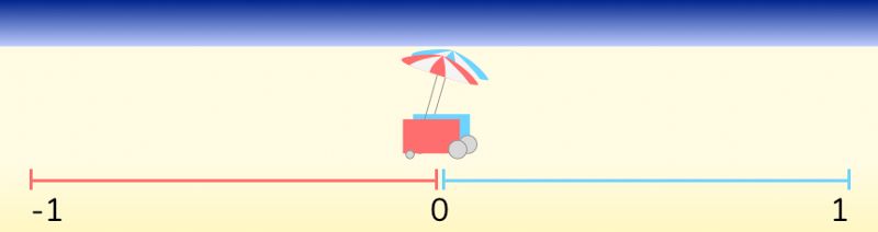 然而,突然有个增加市场份额的机会!如果Red hot dog供应商移动到0标记,它的市场便从-1到0的份额扩大了0到0.5,而Blue供应商保留0.5到1(见下文)。