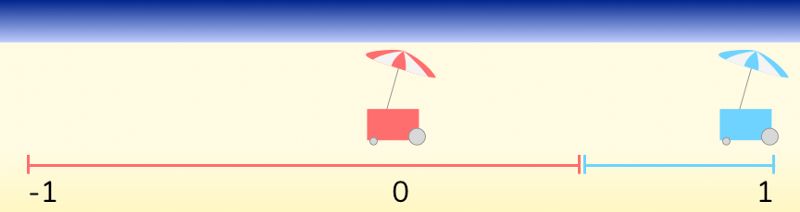 在下图中,我们看到两个热狗摊儿,每个都从海滩的两端开始,分别控制着一半的海滩热狗市场。